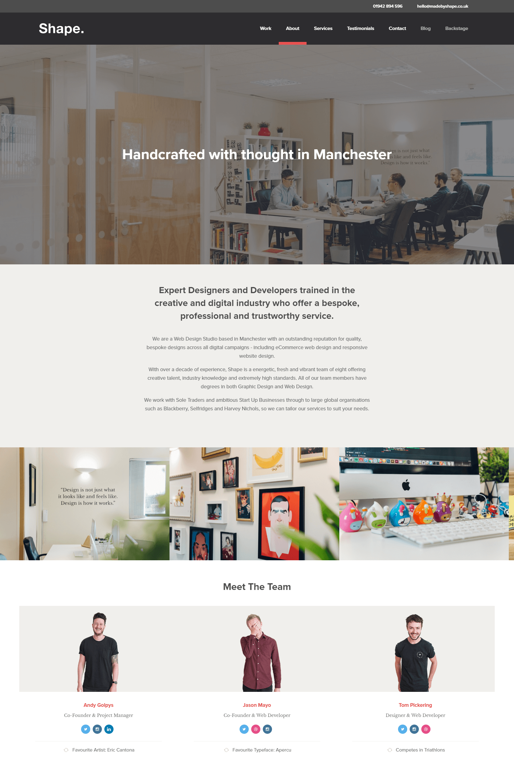Strona Shape obejmuje to wszystko. Nie tylko wyjaśniają, kim są i czym się zajmują, ale także wyraźnie unikają drugiego punktu na „wykresie irytacji” (ich dane kontaktowe znajdują się w nagłówku). Możesz też spotkać się z zespołem i, po przewinięciu w dół, zobaczyć klientów, z którymi pracowali, a nawet niektóre referencje.